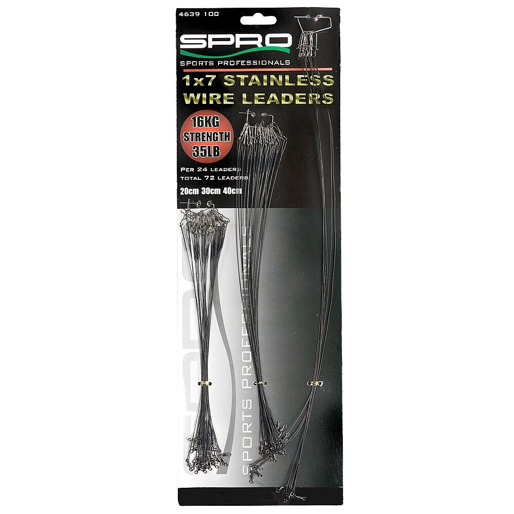 Spro 1×7 Stainless wire leaders 72 stuks op kaart waarvan 24 stuks van 20cm, 24 stuks van 30cm en 24 stuks van 40cm alle leaders hebben trek kracht van 16kg. Uitgevoerd met sterk Roilling swivel en een Fast Lock Snap.